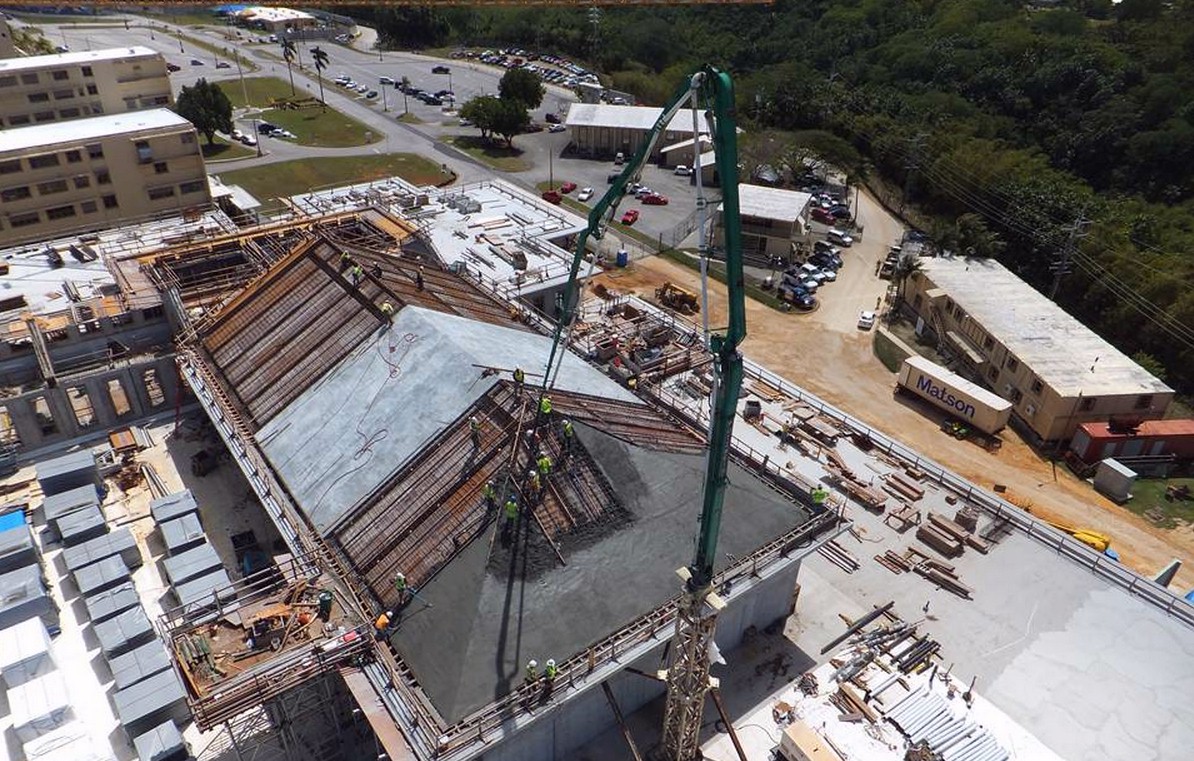 Webcor Construction of California is the Division 3 contractor for the New Naval Hospital in Guam. The 500 million dollar project mandated some heavy placing boom equipment in junction with large trailers. Webcor called on Northwest to not only supply the equipment but, supply enough equipment. Down time would be a huge factor with this project. Northwest supplied two 38 meter placing booms, 2000 feet of pipe, four electric power packs, 3 diversion valves, and three large trailer pumps consisting of two Putzmeister 2110’s. Not one day was lost because of equipment problems.