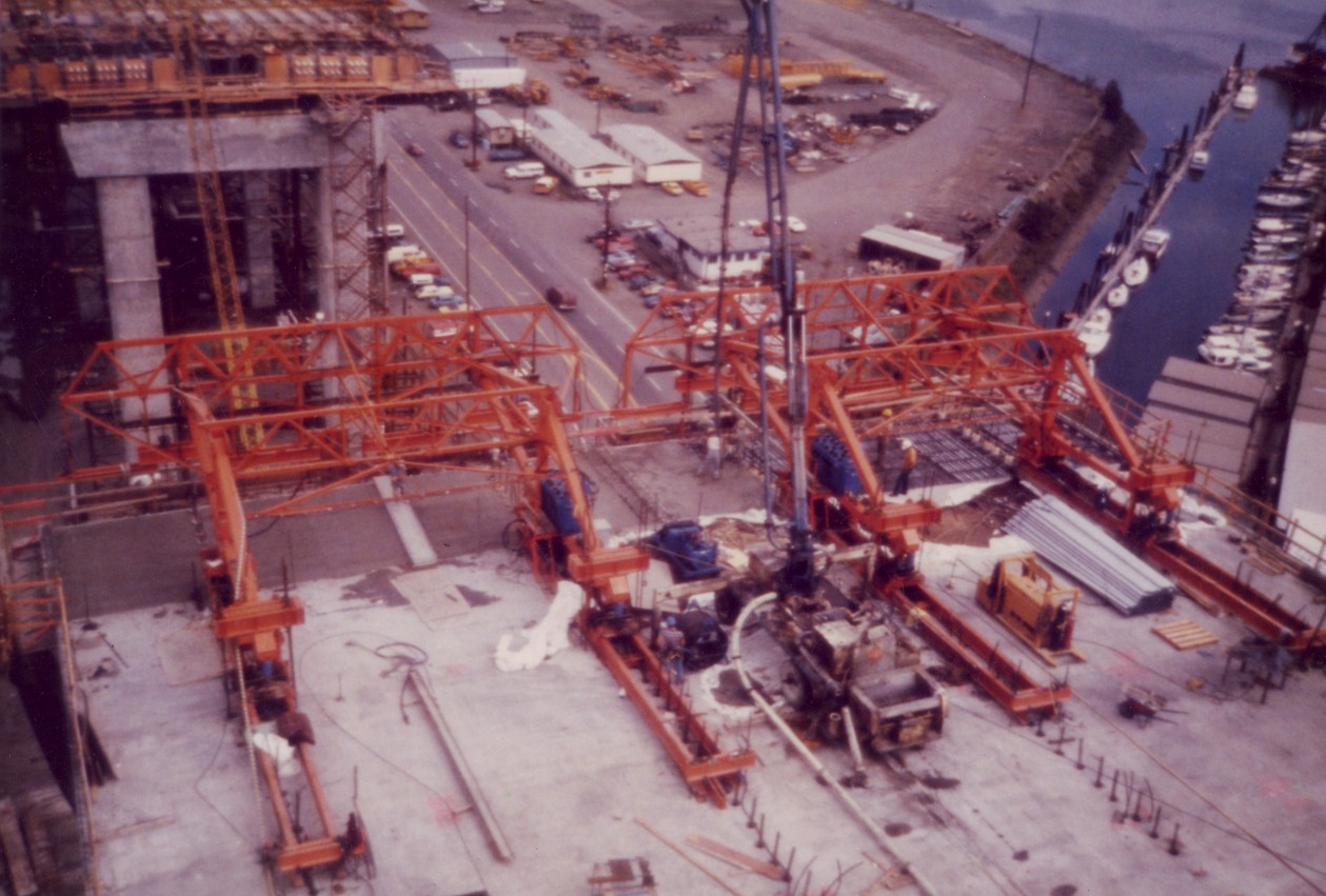 In 1981 the interest rate was 25%. There was little work and the work contractors got was low margin. Kiewit was awarded the 90 million dollar West Seattle Bridge Project. The massive project included two travelers bridge. Mike Phelps was the Superintendent on Pier 6 which was the first traveler. Mike called on Northwest to help in a placing system for the traveler which was 200 feet off the ground. Before placing booms were in the United States Northwest took a Thompsen 875 off the truck mounted it on two steel beams with axles. Placed it 200 feet up on the traveler and placed 12,700 yards of concrete through the machine used as a placing boom with wheels.