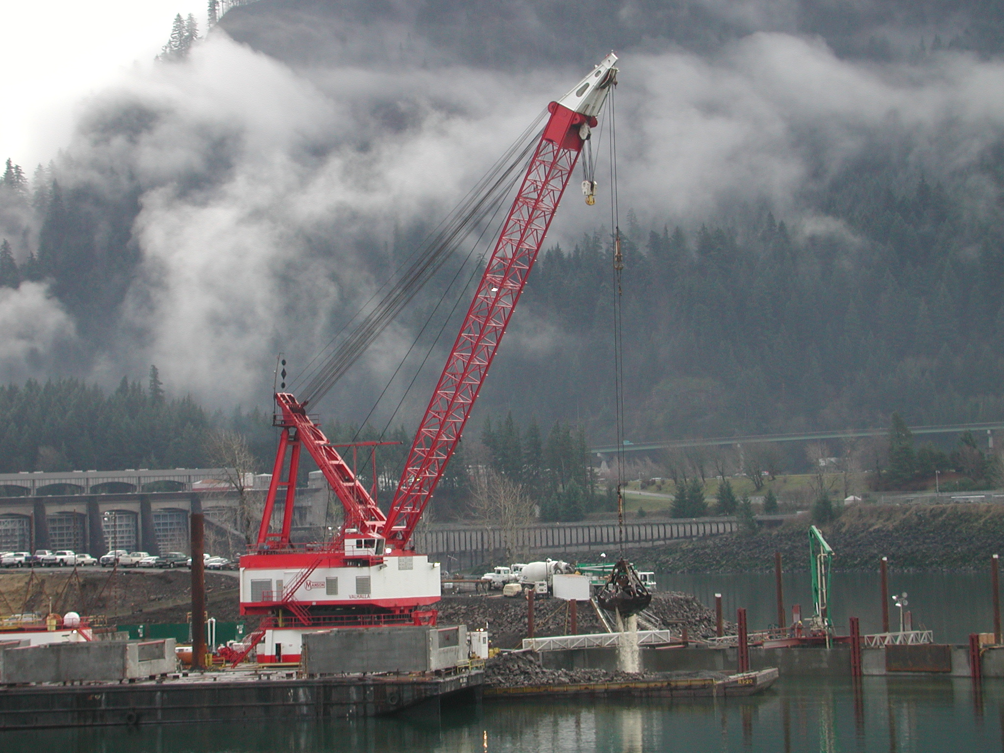 When Manson Construction of Seattle was awarded the water portion of the Oregon Bonneville Dam Fish Ladder project they called on Northwest for equipment and expertise. Northwest engineered and had a special bracket manufactured to hold the 32 meter placing boom atop of the anchors. The anchors consisted of a 26 prefabricated concrete vaults, which were then filled with 980 yards of concrete per vault. The vault then acted as the foundation footing for the twenty-seven foot high walls which formed the passage past the fish ladder.